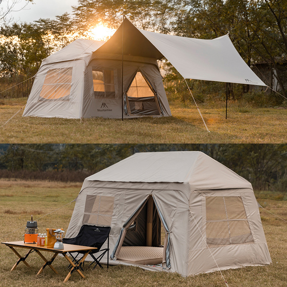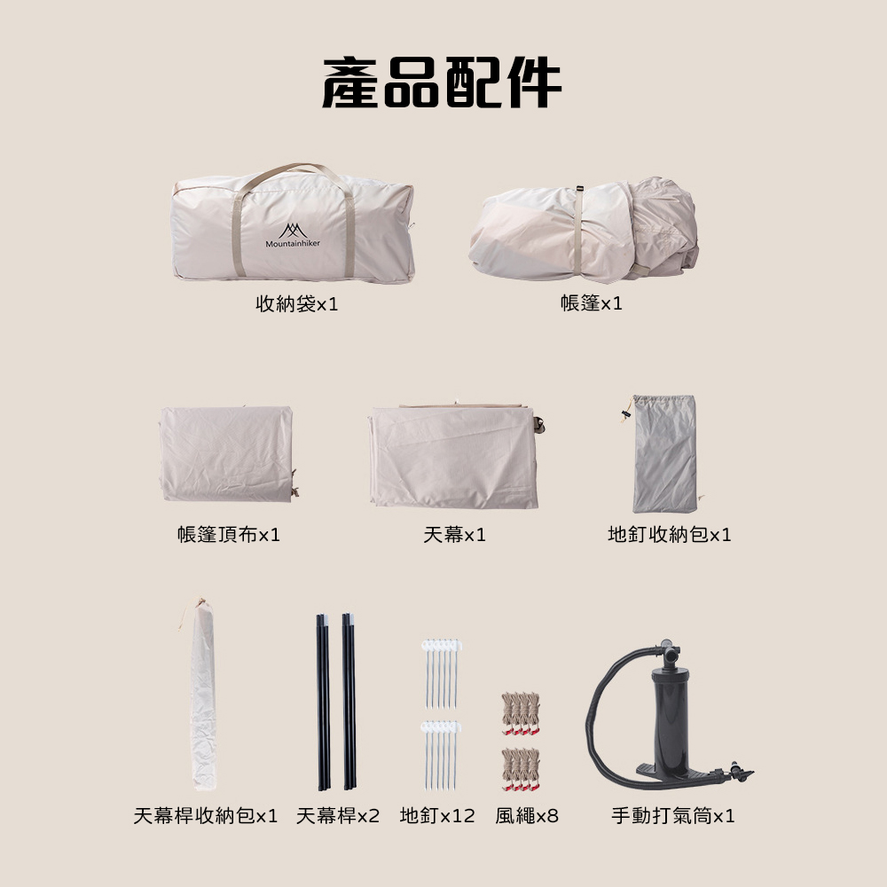 產品內容:收納袋、手動打氣筒、帳篷、頂布、天幕、地釘收納包、天幕桿收納包、天幕桿x2、地釘x12、風繩x8